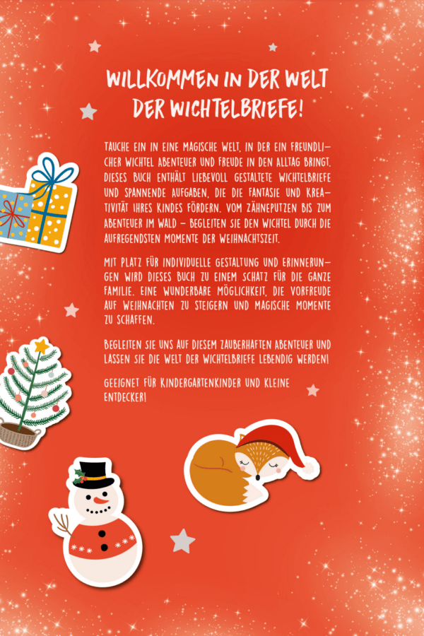 Das Wichtelbriefe Buch wurde sorgfältig und liebevoll gestaltet, um nicht nur die Weihnachtszeit, sondern auch die Tage dazwischen zu bereichern. Jede Seite strahlt Wärme und Zuneigung aus, und jedes Detail wurde mit dem Gedanken an die strahlenden Augen eines Kindes entwickelt.